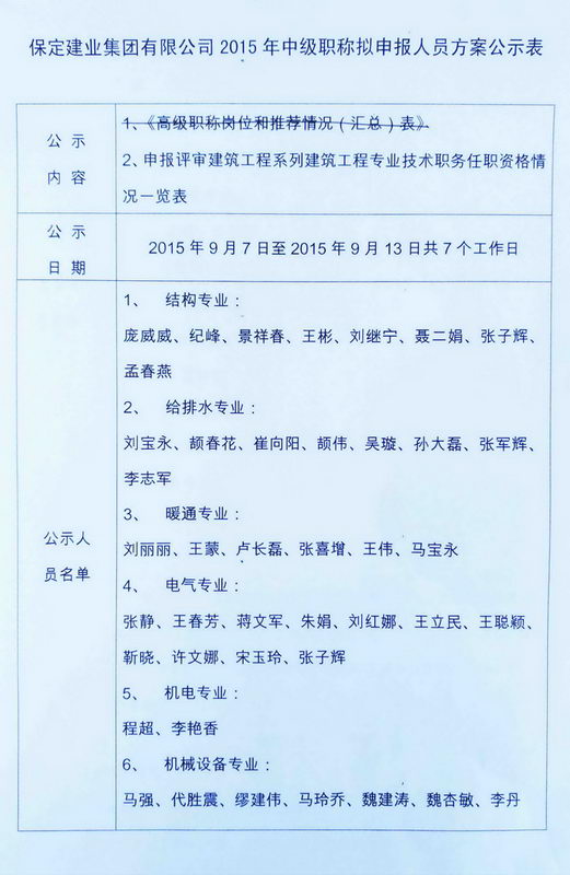 2015中級職稱擬申報人員方案公示