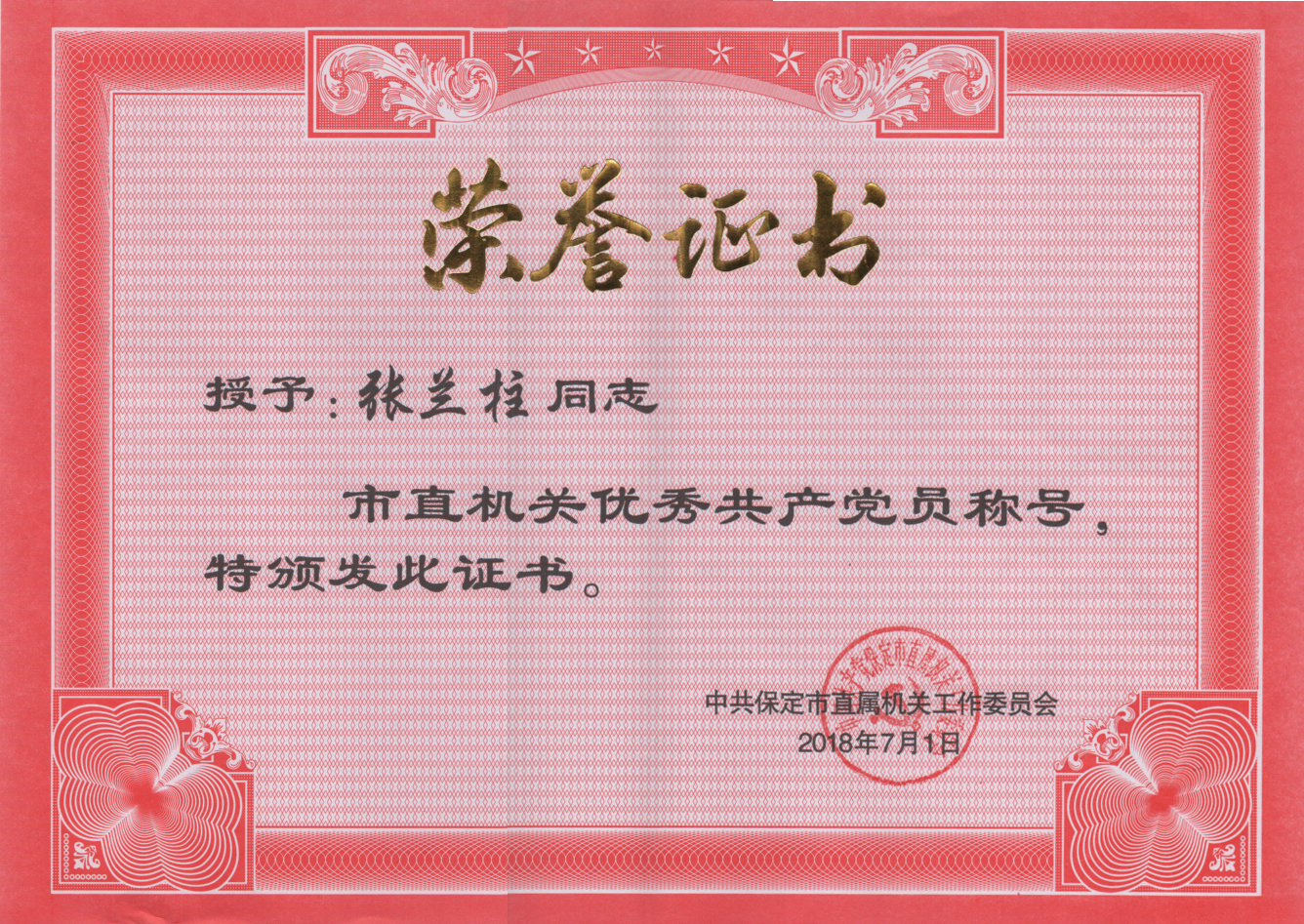 黨委書記張?zhí)m柱榮獲2017年度市直機(jī)關(guān)優(yōu)秀共產(chǎn)黨員榮譽稱號